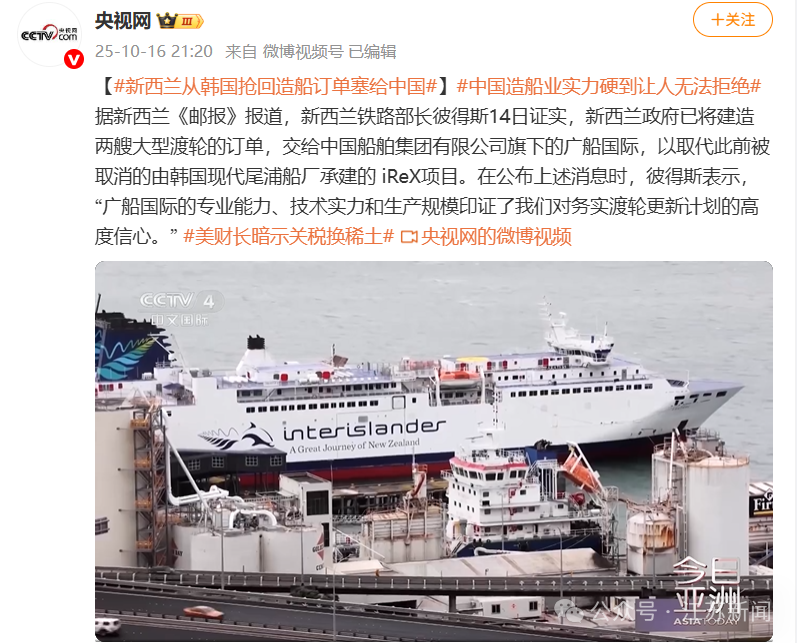 新西兰铁路部长彼得斯10月14日证实,新西兰政府已将建造两艘大型渡轮的订单,交给中国船舶集团有限公司旗下的广船国际,以取代此前被取消的由韩国现代尾浦船厂承建的iReX项目。